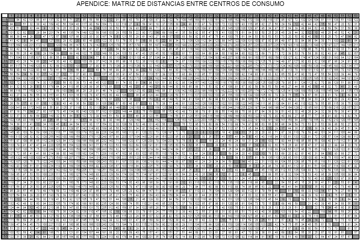 apéndice: Matriz de distancias entre centros de consumo, tabla en la cual se resaltan las distancias entre los arcos conectados de manera directa). El grafo de la